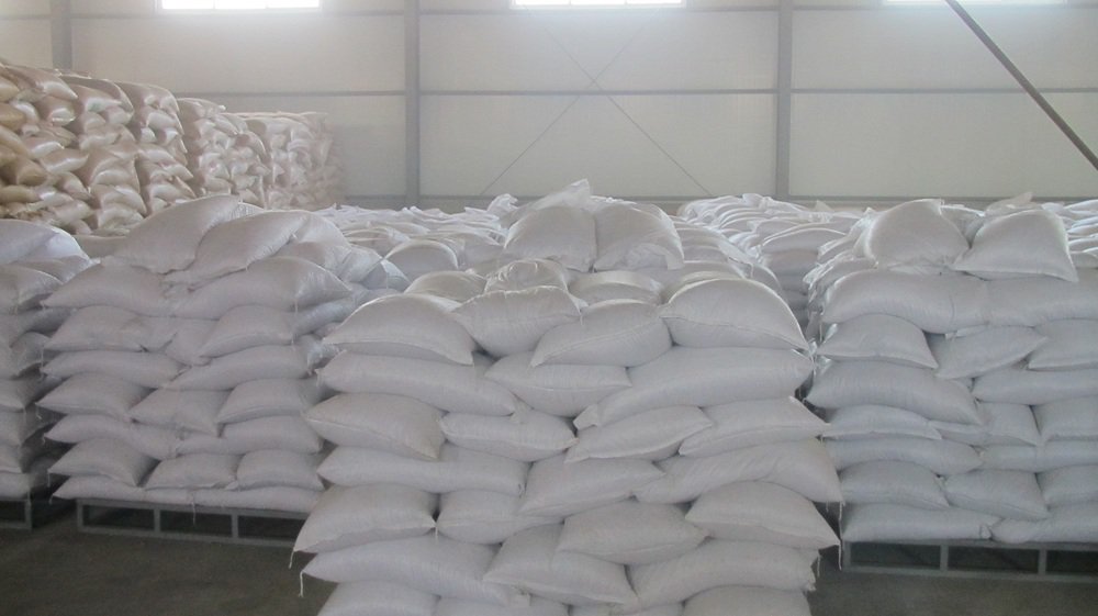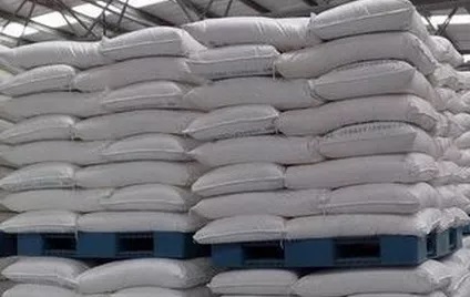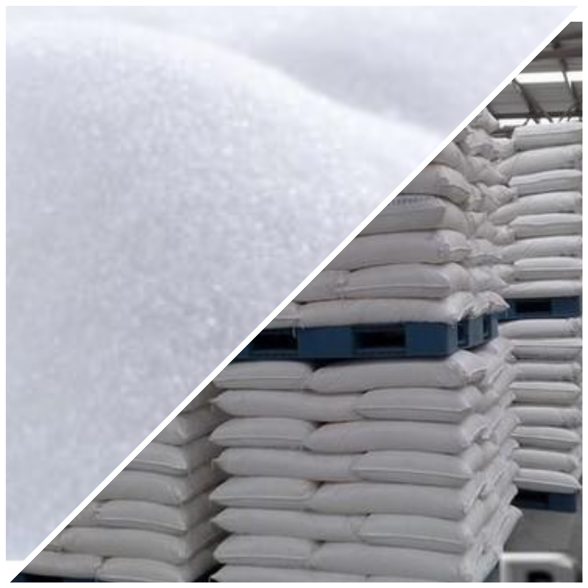 Açúcar refinado de cor branca cristalina embalado em sacos de 50 kg.